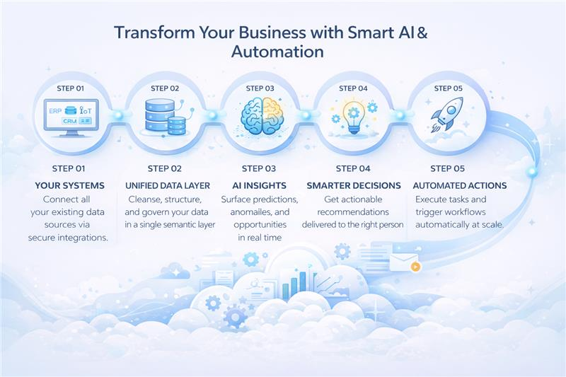 We connect your systems, unify your data, and apply AI to transform raw information into real-time insights and automated actions — helping your business move faster, smarter, and more efficiently.